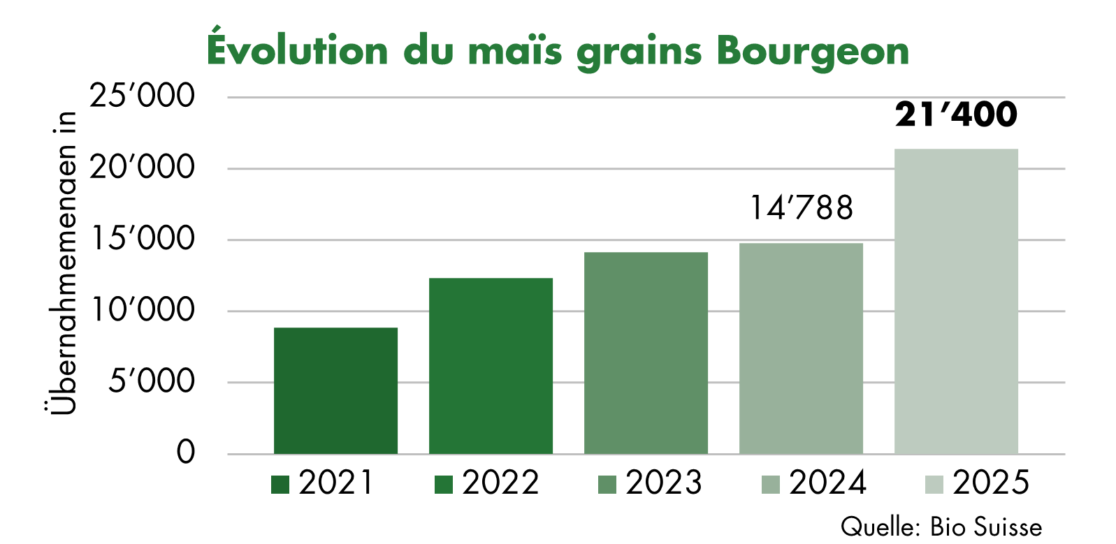 En 2025, la récolte de maïs bio a atteint un chiffre record de 21’400 tonnes, ce qui correspond à une augmentation de 45 % par rapport à 2024. Le secteur réagit en appliquant une retenue sur le maïs grains Bourgeon de CHF 10/dt.